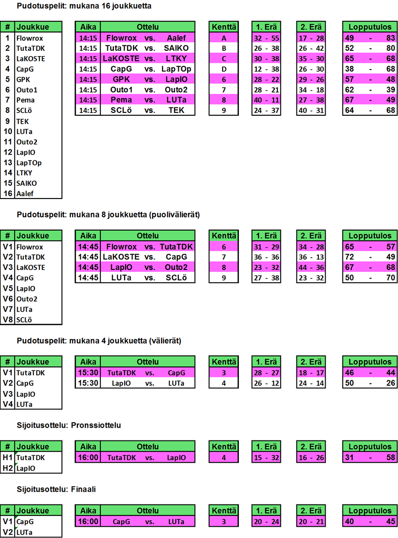 | 13.30 | LUTa | vs. | Outo1 | 55 | - | 46 | 13.30 | CapG | vs. | Aalef | 45 | - | 50 | |||||||||||||||||||||